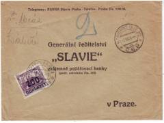 1926 Kamenný Újezd - obálka do pojišťovny Slavie Praha, doplatné na poště Praha 1 zn. DL28 s tiskovou vadou přetisku: skvrna v levém horním rohu známky, ohnutý roh známky před nalepením na obálku - sleva