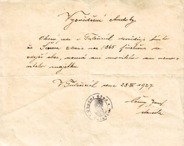 1927 Vysvědčení chudoby, razítko Obecní úřad Tulešice, podpis starosty