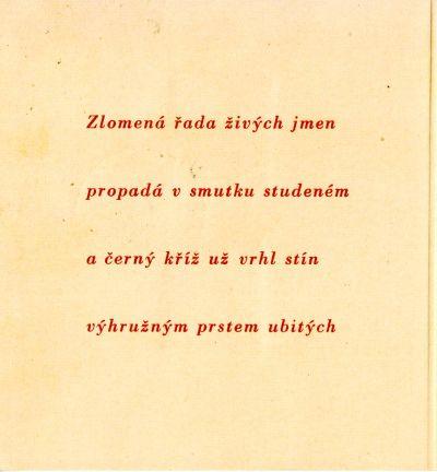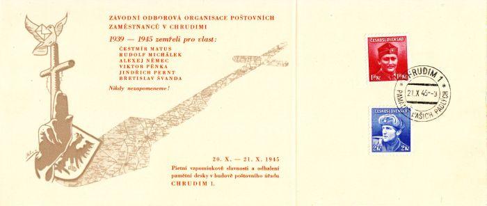 1945 Chrudim Pamětní list organizace poštovních zaměstnanců, příležitostné razítko Chrudim 1 Památce našich padlých 21.X.1945
