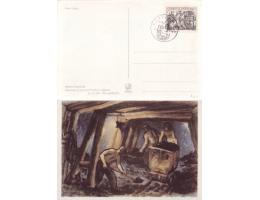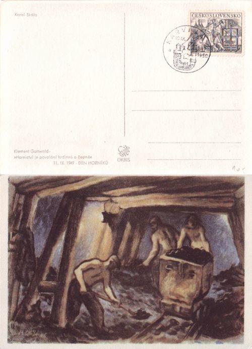 1950 Karviná 2 příležitostné razítko Den horníků, den výstavby Ostravska, na barevné pohlednici Horníci v dole, citát Gottwalda: Hornictví je povolání hrdinné a čestné.