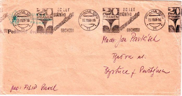 1968 Praha 025 Strojové propagační razítko 20 let státního potravinářského obchodu Pramen, na služební obálce Junák, ústředí skautské výchovy, krátce před opětovnou likvidací Junáka komunisty