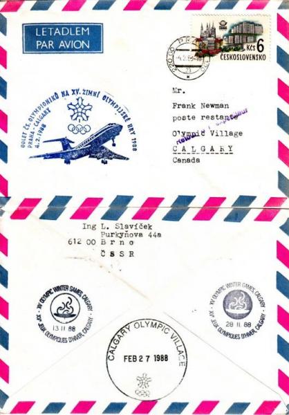 1988 Obálka s kašetem Odlet čs. Olympioniků na XV. ZOH Calgary, adresováno do olympijské vesnice, vráceno se 3 různými olympijskými razítky