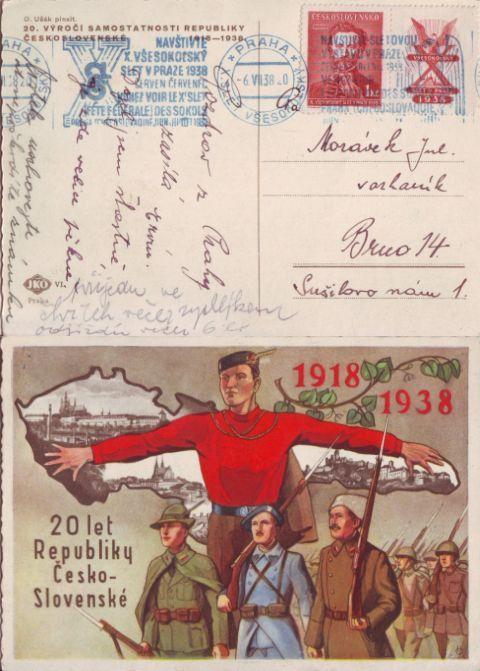 20 let republiky Československé 1938, barevná pohlednice, Praha, sokolové, legionáři, strojové příležitostné razítko Praha Naštivte X. všesokolský slet v Praze 1938