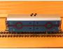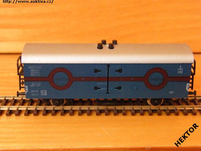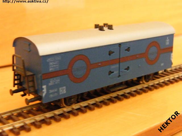 RARITA!!! Sběratelský model 2osého zavřeného chladícího vozu typu (Tnhs - 50), RENFE, "TRANSFESA - INTERFRIGO", karosérie stříkaná tmavou modrou, kulatá střecha hladká stříkaná stříbrnou se 4 černými ventilacemi, logo RENFE tištěno bílou na tmavém modrém podkladu, číslo vozu N 520 106 tištěno bílou na tmavém modrém podkladu, popisy tištěny bílou na tmavém modrém podkladu, na boku jsou dva tmavé červené kruhy propojené tmavou červenou širokou linkou, v kruzích tištěn černou nápis "TRANSFESA - INTERFRIGO" na tmavém modrém podkladu, vlevo dole bílý čtvereček, bez přechodek, stupačky pod dveřmi černé, na obou čelech zvýšené přechodové umělohmotné lávky černé barvené ve hmotě, spodek vozu černý na západky, brzdová soustava součástí spodku vozu. Výrobcem BTTB koncem 80. let, kat. č. 14341. Výměnná spřáhla a kovová dvojkolí. Po zakoupení byl model odložen do vitríny a neježděn, je dlouho neježděn. Bez originální krabičky.