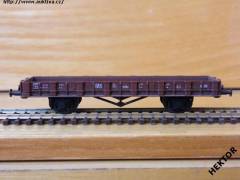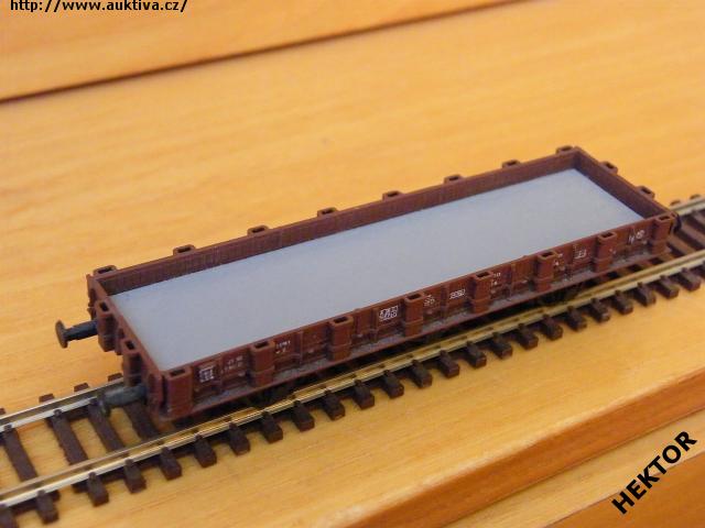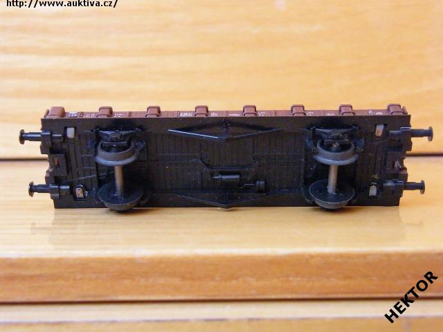 Sběratelský model 2osého nízkostěnného vozu s vyjímatelnými klanicemi (dodám) typu Rm, DR, prázdný, karosérie stříkaná hnědočervenou a plechová podlaha stříkaná šedou, logo a popisy tištěny bílou na hnědočerveném podkladu, přechodky lisované obtažené bílou, spodek vozu černý zajištěný kovovými jazýčky z podlahy, brzdová soustava součástí spodku vozu. Výrobcem BTTB v 70. letech, kat. č. 4620. Výměnná spřáhla a umělohmotná dvojkolí. Po zakoupení byl model občas ježděn, je dlouho neježděn. Bez originální krabičky. Klanice dodám.