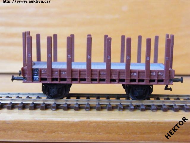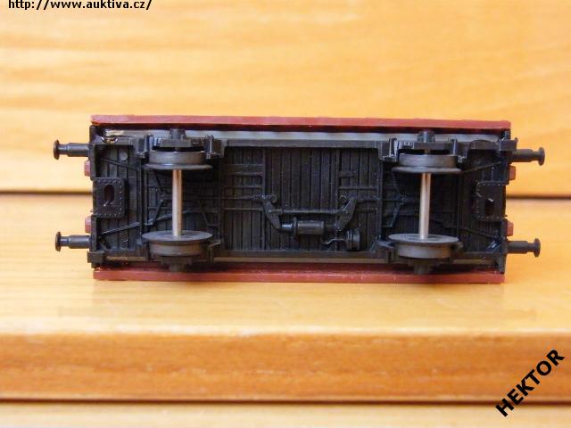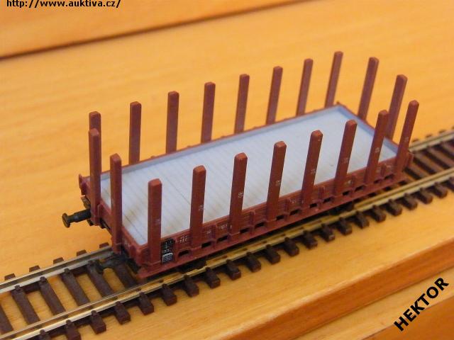 RARITA!!! Sběratelský model 2osého plošinového vozu s pevnými umělohmotnými klanicemi typu R, DR, prázdný, karosérie stříkaná hnědočervenou a podlaha stříkaná šedou, logo i na klanicích a popisy tištěny bílou na hnědočerveném podkladu, vlevo černý obdélníček, spodek vozu černý lepený, brzdová soustava součástí spodku vozu. Výrobcem Zeuke koncem 60. let, kat. č. 545/90. Výměnná spřáhla a umělohmotná dvojkolí. Po zakoupení byl model odložen a pouze občas ježděn, je dlouho neježděn. Bez originální krabičky.