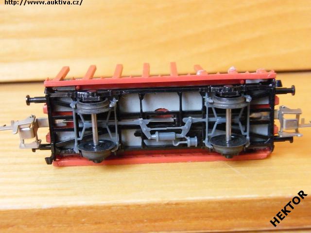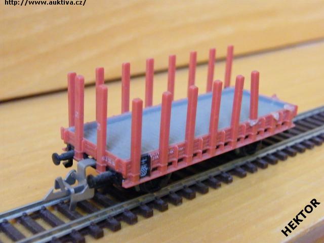Model 2osého plošinového vozu s pevnými umělohmotnými klanicemi typu R, DR, karosérie typu I stříkaná jasnou hnědočervenou a podlaha stříkaná šedou, logo i na klanicích a popisy tištěny bílou na jasně hnědočerveném podkladu, vlevo černý obdélníček, spodek vozu černý příhradový lepený, brzdová soustava vkládaná šedá. Výrobcem Zeuke od 60. let, kat. č. 159/90. Průběžné spřáhlo Zeuke stříbrné a umělohmotná dvojkolí. Po zakoupení z druhé ruky byl model pouze občas ježděn, je dlouho neježděn. Bez originální krabičky. Chybí 4 klanice a 1 klanice je lepená - poskytnuta sleva 250 Kč.
