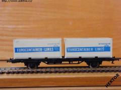 Sběratelský model 2osého plošinového vozu typu Sm, DR, ložený 2 krémovými kontejnery EUROCONTAINER LINES, bez loga a popisů, karosérie a spodek vozu stříkaný černou, na podlaze 8 kolíčků pro uchycení kontejnérů, brzdová soustava součástí spodku vozu. Bez klanic. Výrobcem BTTB koncem 80. let, kat. č. 14521. Výměnná spřáhla a kovová dvojkolí. Po zakoupení byl model odložen do vitríny a neježděn, je dlouho neježděn. Bez originální krabičky.