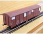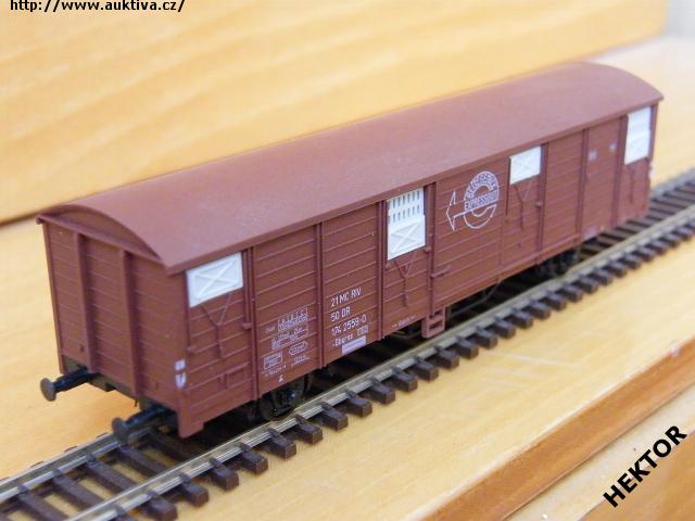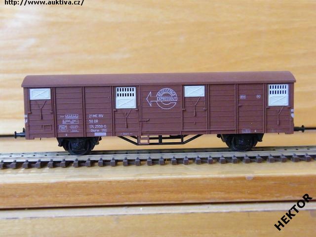 RARITA!!! Sběratelský model 2osého zavřeného vozu typu Gbqrss (Glmms 14; Gbs), DR, "REISEGEPÄCK EXPRESSGUT", karosérie stříkaná hnědočervenou, plochá střecha hladká stříkaná hnědočervenou, logo DR tištěno bílou na hnědočerveném podkladu, číslo vozu 21 50 174 2 559 – 0 tištěno bílou na hnědočerveném podkladu, popisy tištěny bílou na hnědočerveném podkladu, na dveřích tištěn bílou kruh se šipkou vlevo bílým nápisem "REISEGEPÄCK EXPRESSGUT" na hnědočerveném podkladu, vlevo dole není černý obdélníček, přechodky lisované hnědočervené, ventilace na boku šedé, spodek vozu černý na západky se vzpěrami rámu a 3 svislými výztuhami, brzdová soustava součástí spodku vozu. Výrobcem BTTB v 80. letech, kat. č. 04154. Výměnná spřáhla a umělohmotná dvojkolí. Po zakoupení byl model odložen do vitríny a neježděn, je dlouho neježděn. Bez originální krabičky.