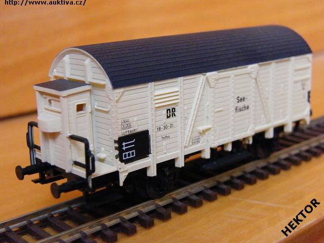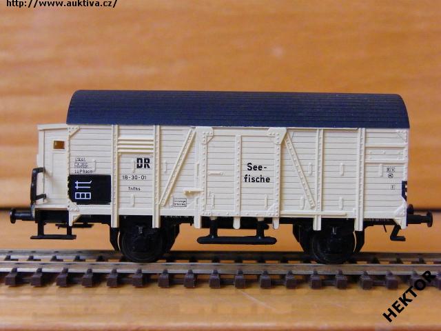 RARITA!!! Sběratelský model 2osého zavřeného vozu s brzdařskou budkou typu Tnfhs, DR, karosérie dřevěná stříkaná krémovou, brzdařská budka stříkaná krémovou vč. podlahy, zábradlí stříkané černou, stupačka pod dveřmi stříkaná černou, kulatá střecha součástí karosérie stříkaná černou podélně drážkovaná, střecha brzdařské budky stříkaná černou, logo DRG tištěné černou na krémovém podkladu, číslo vozu 18 - 30 - 01 tištěné černou - III. epocha na krémovém podkladu, popisy tištěné černou na krémovém podkladu, na dveřích tištěn černou malý vodorovný nápis "See - fische" na krémovém podkladu, vlevo dole černý obdélníček s bílými linkami, bez přechodek, spodek vozu černý lepený, brzdová soustava součástí spodku vozu. Výrobcem Tillig od roku 1996 do roku 2008, kat. č. 14372. Výměnná spřáhla a kovová dvojkolí černěná. Po zakoupení byl model odložen do vitríny a neježděn, je dlouho neježděn. Bez originální krabičky.