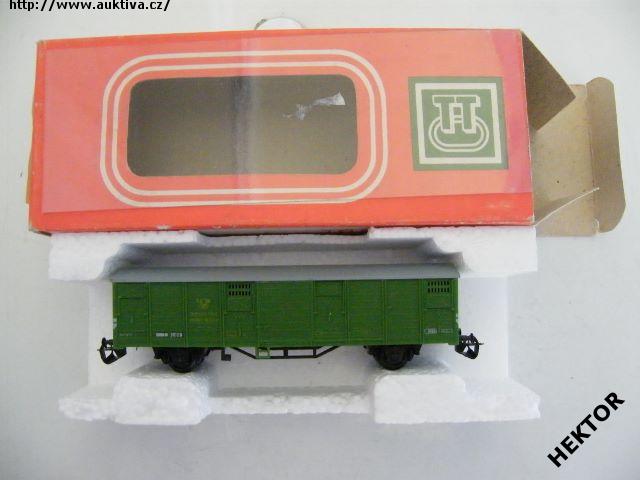 RARITA!!! Sběratelský model 2osého zavřeného vozu typu Glmms 14 (Bahnpostwagen; Gbs), (DR), "DEUTSCHE POST", karosérie stříkaná zelenou, plochá střecha hladká stříkaná šedou, logo DEUTSCHE POST tištěno žlutou na zeleném podkladu ve 3 poli z leva, bez loga DR, číslo vozu 50 50 09 - 10 113 – 8 tištěno žlutou na zeleném podkladu, popisy tištěny bílou a žlutou na zeleném podkladu, ve 3 poli z leva tištěna žlutou trubka na zeleném podkladu, vlevo dole 2 černé obdélníčky s bílými popisy, přechodky lisované zelené, ventilace na boku zelené, spodek vozu černý na západky se vzpěrami rámu a 3 svislými výztuhami, brzdová soustava součástí spodku vozu, dole žluté brzdové kolečko. Výrobcem BTTB od roku 1985, kat. č. 04155. Výměnná spřáhla a umělohmotná dvojkolí. Po zakoupení byl model odložen do vitríny a neježděn, je dlouho neježděn. Chybí 2 brzdová kolečka – sleva 50 Kč. V originální krabičce.