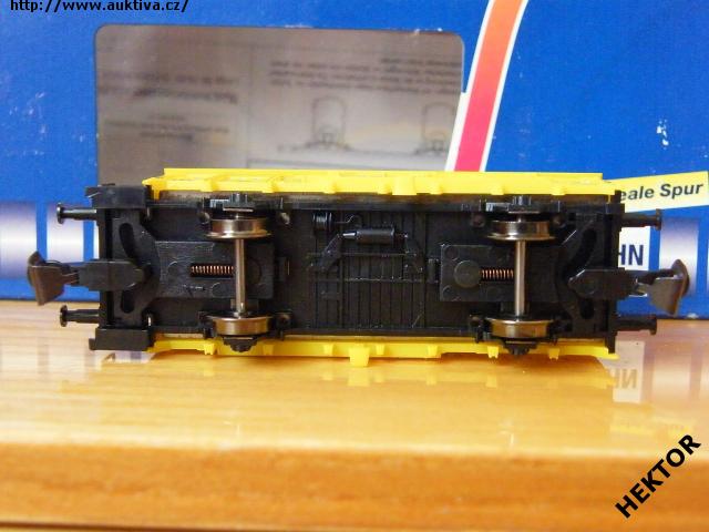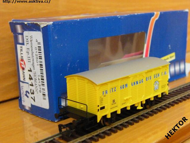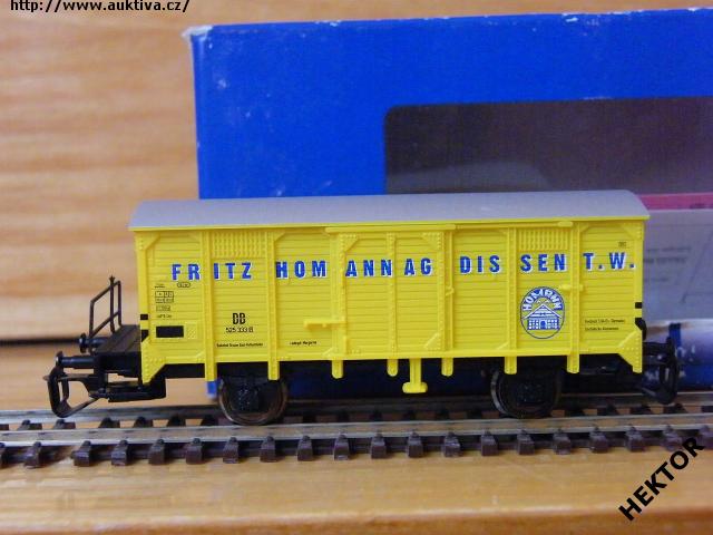 RARITA!!! Sběratelský model 2osého zavřeného vozu typu G 10 s brzdovou lávkou, DB, karosérie I. typu stříkaná žlutou a střecha stříbrnou, logo DB tištěno černou, popisy tištěny černou, nahoře na boku tištěn modrý nápis s bílým stínováním „FRITZ HOMANN AG DISSENT. W.“ na žlutém podkladu, vpravo dole tištěno barevné logo firmy na žlutém podkladu, vlevo dole černý obdélníček a přechodky lisované žluté, jemné zábradlí brzdové lávky a podlaha černé, spodek vozu černý lepený, brzdová soustava vkládaná do spodku vozu. Výrobcem Tillig v letech 2001-4, kat. č. 14137. Kinematika se šachtou pro krátké spřáhlo + 2 krátká spřáhla Fleischmann + 1 pevné spřáhlo a kovová dvojkolí černěná. Po zakoupení byl model odložen do vitríny a neježděn, je dlouho neježděn. V originální krabičce. Model vyroben podle skutečného vozu z Museumswagen Warmeschutzwagen.