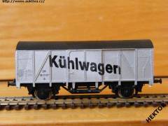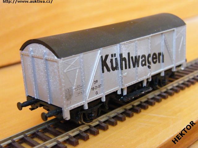 RARITA!!! Sběratelský model 2osého zavřeného vozu bez brzdařské budky typu G, DR, „Kühlwagen“, karosérie kovová stříkaná stříbrnou, stupačka pod dveřmi stříkaná černou, kulatá střecha jako samostatný výlisek stříkaná černou hladká, logo DR tištěné černou na stříbrném podkladu, číslo vozu 16 - 01 - 57 tištěné černou - III. epocha na stříbrném podkladu, na boku tištěn černou velký šikmý nápis „Kühlwagen“ na stříbrném podkladu, popisy tištěné černou na stříbrném podkladu, vlevo dole není černý obdélníček, bez přechodek, spodek vozu černý lepený, brzdová soustava součástí spodku vozu. Výrobcem Krüger počátkem 90. let, katalogové číslo neznám. Výměnná spřáhla BTTB a kovová dvojkolí - Malá železnice - dovoz do Německa. Po zakoupení byl model odložen do vitríny a neježděn, je dlouho neježděn. Bez originální krabičky.