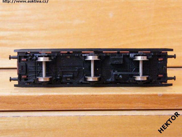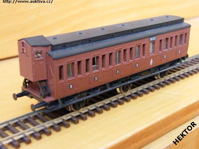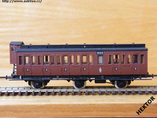 RARITA!!! VÝROBNÍ ZMETEK!!! Sběratelský model 3osého oddílového osobního vozu typu C3 Pr 07 s brzdařskou budkou, KPEV, 3. třída, epocha II, karosérie stříkaná hnědou vč. brzdařské budky, logo KPEV tištěné bílou uprostřed pod okny na hnědém podkladu, čísla třídy tištěna bílou na černém čtverečku na dveřích jednotlivých oddílů, číslo vozu 1652 tištěno bílou na černém podkladu nad okny, bez popisů na rámu, bez směrové cedule, střecha je samostatný výlisek stříkaná černou, kovové černé lávky po celé délce vozu, rámy oken nahoře hranaté a ve dveřích kulaté, v oknech propracovaný plast s hnědými rámy, spodek vozu umělohmotný černý na západky osazený odpadní rourou a !!!DYNAMEM!!!, brzdová soustava součástí spodku vozu. Výrobcem BTTB koncem 80. let, kat. č. 13138. Výměnná spřáhla typu BTTB černá a kovová dvojkolí, prostřední dvojkolí pohyblivé do stran. Po zakoupení byl model odložen do vitríny a neježděn, je dlouho neježděn. Bez originální krabičky.