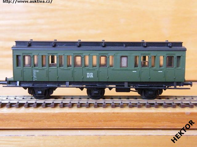 Sběratelský model 3osého oddílového osobního vozu typu C3 Pr 07 bez brzdařské budky, DR, 3. třída, epocha III, karosérie stříkaná zelenou, logo DR tištěné bílou uprostřed pod okny na zeleném podkladu, bez čísla třídy, číslo vozu 522 - 462 a popisy tištěny bílou vlevo pod okeny na zeleném podkladu, bez směrové cedule, střecha je samostatný výlisek stříkaná černou, kovové černé lávky po celé délce vozu, rámy oken nahoře hranaté a ve dveřích kulaté, v oknech propracovaný plast s hnědými rámy, spodek vozu umělohmotný černý na západky osazený odpadní rourou a dynamem, brzdová soustava součástí spodku vozu. Výrobcem BTTB v 80. letech, kat. č. 03130. Výměnná spřáhla typu BTTB černá a umělohmotná dvojkolí, prostřední dvojkolí pohyblivé do stran. Po zakoupení byl model odložen do vitríny a neježděn, je dlouho neježděn. Bez originální krabičky.
