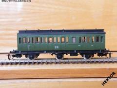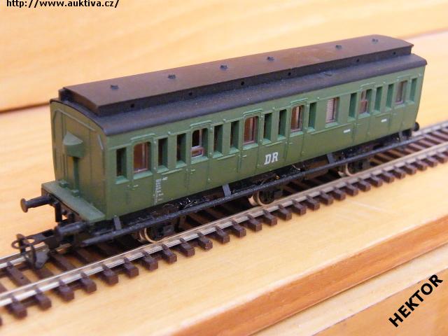 Sběratelský model 3osého oddílového osobního vozu typu C3 Pr 07 bez brzdařské budky, DR, 3. třída, epocha III, karosérie stříkaná zelenou, logo DR tištěné bílou uprostřed pod okny na zeleném podkladu, bez čísla třídy, číslo vozu 522 - 462 a popisy tištěny bílou vlevo pod okny na zeleném podkladu, bez směrové cedule, střecha je samostatný výlisek stříkaná černou, kovové černé lávky po celé délce vozu, rámy oken nahoře hranaté a ve dveřích kulaté, v oknech propracovaný plast s hnědými rámy, spodek vozu umělohmotný černý na západky osazený odpadní rourou a dynamem, brzdová soustava součástí spodku vozu. Výrobcem BTTB koncem 80. let, kat. č. 13130. Spřáhla uložena v domečku na spodku vozu typu BTTB s kuličkou černá a kovová dvojkolí, prostřední dvojkolí pohyblivé do stran. Po zakoupení byl model odložen do vitríny a neježděn, je dlouho neježděn. Bez originální krabičky.