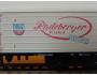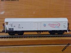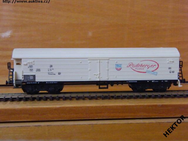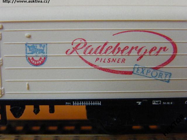 RARITA!!! Sběratelský model 4osého zavřeného chladícího vozu typu TTnhh (TThhns), DR, "Radeberger Pilsner", karosérie II. typu podélně rýhovaná stříkaná krémovou, kulatá střecha s podélným rýhováním stříkaná světlou okrovou, logo DR tištěno černou na krémovém podkladu, číslo vozu 21 50 837 5 193 - 7 tištěno černou na krémovém podkladu, popisy tištěny černou na krémovém podkladu na karosérii, NĚMECKÉ popisy tištěny bílou na černém podkladu na spodku vozu, vpravo na boku tištěn červenou větší nápis "Radeberger Pilsner" v červeném oválu a vpravo dole šikmý modrý obdélníček s nápisem "EXPORT" na krémovém podkladu, mezi dveřmi a nápisem tištěno barevné logo pivovaru - HORNÍ HRANA LOGA JE POD 2 PROLISEM SHORA – na krémovém podkladu, vlevo dole černý obdélníček, přechodky lisované krémové na černém podkladu, na jednom čele dveře do strojovny chlazení a kovové schůdky černé, na čelech zvýšené přechodové lávky kovové černé uchycené nárazníky, spodek vozu černý vkládaný zajištěný nárazníky, 2osé podvozky černé III. typu uchycené na čep do spodku vozu, brzdová soustava součástí podvozku. Výrobcem BTTB v 80. letech, kat. č. 05313. Výměnná spřáhla a umělohmotná dvojkolí. Po zakoupení byl model odložen do vitríny a neježděn, je dlouho neježděn. Bez originální krabičky.