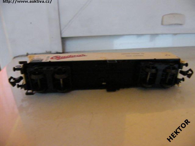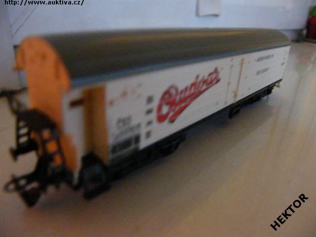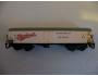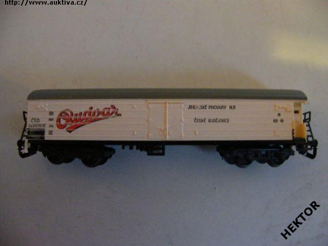 RARITA!!! Sběratelský model 4osého zavřeného chladícího vozu typu La, ČSD, "Budvar", karosérie I. typu podélně rýhovaná stříkaná krémovou, kulatá střecha s podélným rýhováním stříkaná tmavší šedou, logo ČSD tištěno černou na krémovém podkladu, číslo vozu La 516 790 tištěno černou na krémovém podkladu, popisy tištěny černou na krémovém podkladu na karosérii, ČESKÉ popisy tištěné slabě bílou na černém podkladu na spodku vozu, na boku vlevo tištěn červenou větší šikmý nápis "Budvar" s černým rámováním na krémovém podkladu, na boku vpravo tištěny černou nápisy "JIHOČESKÉ PIVOVARY N.P.; ČESKÉ BUDĚJOVICE" na krémovém podkladu, vlevo dole černý obdélníček, přechodky tištěné krémové na černém podkladu, na jednom čele dveře do strojovny chlazení a kovové schůdky černé, na čelech zvýšené přechodové lávky kovové černé uchycené nárazníky, spodek vozu černý vkládaný zajištěný nárazníky, 2osé podvozky černé I. typu uchycené na čep do spodku vozu, brzdová soustava součástí podvozku. Výrobcem BTTB začátkem 70. let, kat. č. 5311. Výměnná spřáhla a umělohmotná dvojkolí. Po zakoupení byl model občas ježděn, je dlouho neježděn. Ve staré originální krabičce BTTB.