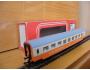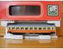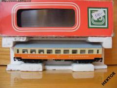 Sběratelský model 4osého bufetového vozu typu REKO provedení WRge, DR, SPEISEWAGEN, epocha IV, karosérie stříkaná v úrovni oken krémovou a pod okny oranžovou i na rámu, čela celá stříkaná oranžovou, logo DR tištěné bílou uprostřed pod okny na oranžovém podkladu, číslo vozu 57 50 89 - 45 024 - 9 a popisy tištěny bílou na oranžovém podkladu i na rámu, pod okny tištěny bílou 2 větší nápisy SPEISEWAGEN na oranžovém podkladu, nad okny tištěny oranžovou nápisy na krímovém podkladu, bez směrové cedule, střecha hladká s ventilacemi stříkaná světlejší šedou, rámy oken v rozích kulaté, v oknech umělohmotný propracovaný výlisek se zvýrazněnou horní vyklápěcí částí stříbrnou, spodek vozu umělohmotný černý zaklapávací, 2osé podvozky umělohmotné černé, brzdová soustava součástí podvozku. NÁSTAVCE NA STOLEČCÍCH BEZ OTVORŮ - PLNÉ. Výrobcem BTTB koncem 80. let, kat. č. 13751. Výměnná spřáhla typu BTTB černá a kovová dvojkolí pro odběr proudu pro osvětlení vozu. Po zakoupení byl model odložen do vitríny a neježděn, je dlouho neježděn. V originální krabičce.
