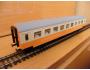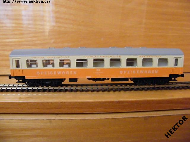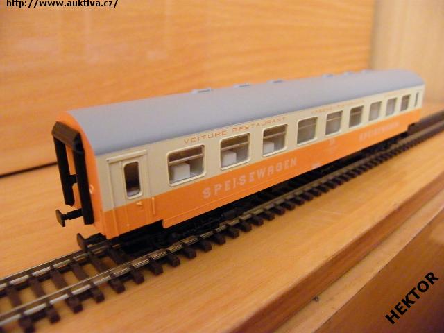 Sběratelský model 4osého bufetového vozu typu REKO provedení WRge, DR, SPEISEWAGEN, epocha IV, karosérie stříkaná v úrovni oken krémovou a pod okny oranžovou i na rámu, čela celá stříkaná oranžovou, logo DR tištěné bílou uprostřed pod okny na oranžovém podkladu, číslo vozu 57 50 89 - 45 024 - 9 a popisy tištěny bílou na oranžovém podkladu i na rámu, pod okny tištěny bílou 2 větší nápisy SPEISEWAGEN na oranžovém podkladu, nad okny tištěny oranžovou nápisy na krímovém podkladu, bez směrové cedule, střecha hladká s ventilacemi stříkaná světlejší šedou, rámy oken v rozích kulaté, v oknech umělohmotný propracovaný výlisek se zvýrazněnou horní vyklápěcí částí stříbrnou, spodek vozu umělohmotný černý zaklapávací, 2osé podvozky umělohmotné černé, brzdová soustava součástí podvozku. NÁSTAVCE NA STOLEČCÍCH BEZ OTVORŮ - PLNÉ. Výrobcem Tillig v 90. letech, kat. č. 13751. Výměnná spřáhla typu BTTB černá a kovová dvojkolí černěná pro odběr proudu pro osvětlení vozu – 2 osyčky trochu rezavé. Po zakoupení byl model odložen do vitríny a neježděn, je dlouho neježděn. Bez originální krabičky.