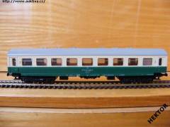 Sběratelský model 4osého osobního vozu typu REKO provedení Bghwe, DR, 2 třída, epocha IV, karosérie stříkaná v úrovni oken krémovou a pod okny brčálovou zelenou i na rámu, čela celá stříkaná brčálovou zelenou, logo DR tištěné bílou uprostřed pod okny na brčálovém zeleném podkladu, čísla třídy tištěna černou u dveří na krémovém podkladu, číslo vozu 57 50 28 - 15 206 - 2 a popisy tištěny bílou na brčálovém zeleném podkladu i na rámu, bez směrové cedule, střecha hladká s ventilacemi stříkaná světlejší šedou, rámy oken v rozích kulaté, v oknech umělohmotný propracovaný výlisek se zvýrazněnou horní vyklápěcí částí stříbrnou, spodek vozu umělohmotný černý zaklapávací, 2osé podvozky umělohmotné černé, brzdová soustava součástí podvozku. Výrobcem BTTB od roku 1982, kat. č. 03621. Výměnná spřáhla typu BTTB černá a umělohmotná - kovová dvojkolí pro odběr proudu pro osvětlení vozu - vnitřní a koncové osvětlení. Po zakoupení byl model odložen do vitríny a neježděn, je dlouho neježděn. Bez originální krabičky.
