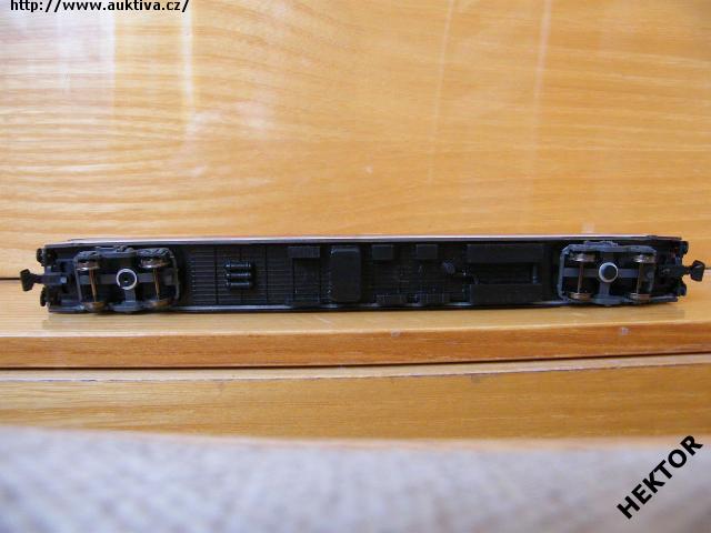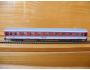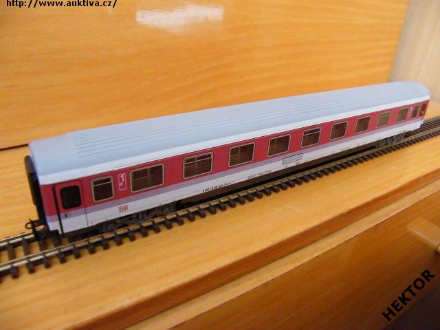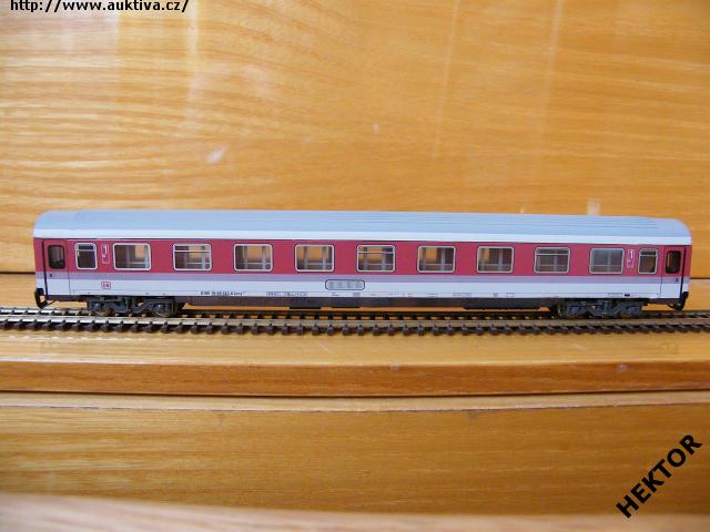RARITA!!! Sběratelský model 4osého rychlíkového osobního vozu typu Eurofima provedení Avmz 267, DB, 1. třída, 9 oddílů, karosérie stříkaná v úrovni oken tmavší červenou a pod tím fialový proužek a dolů švětlá šedá i na rámu, pod rámem tmavé šedé kryty, vlevo dole tištěno červenou logo DB s rámečkem, popisy tištěny černou na rámu, čísla třídy a piktogrami tištěny bílou mezi okny, nad okny není pruh označující 1. třídu, bez směrové cedule, střecha podélně drážkovaná stříkaná šedou a na krajích světlé šedé proužky, spodek vozu černý, 2osé podvozky umělohmotné tmavé šedé, brzdová soustava součástí podvozku. Výrobcem TT model roku 2003-5, kat. č. 7611. Kinematika se šachtou pro krátké spřáhlo a kovová dvojkolí černěná pro odběr proudu pro osvětlení vozu. Po zakoupení byl model odložen do vitríny a neježděn, je dlouho neježděn. V originální krabičce.