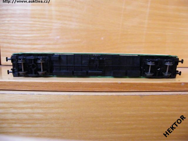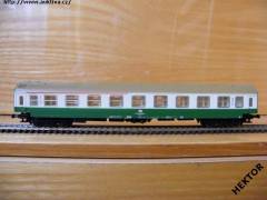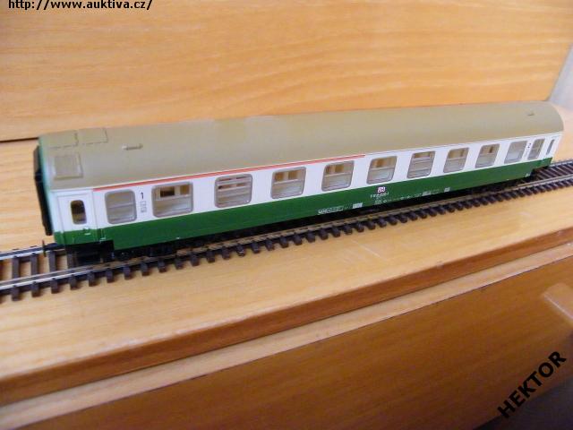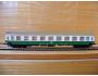 Sběratelský model 4osého rychlíkového vozu typu Y provedení ABme, DB AG, 1. a 2. třída, epocha IV, karosérie stříkaná v úrovni oken krémovou a pod okny tmavší zelenou i na rámu, čela stříkaná celá tmavší zelenou, logo DB tištěné bílou s rímečkem uprostřed pod okny na tmavším zeleném podkladu, číslo vozu a popisy tištěny bílou na tmavším zeleném podkladu i na rámu, nad 1. třídou je oranžový pruh, čísla třídy a piktogramy tištěny černou mezi okny na krémovém podkladu, bez směrové cedule, !!!STŘECHA STŘÍKANÁ TMAVŠÍ OKROVOU!!!, v oknech propracovaný plastový výlisek a rámy obtažené stříbrnou, spodek vozu umělohmotný černý zaklapávací, 2osé podvozky umělohmotné černé, brzdová soustava součástí podvozku. Výrobcem Tillig v 90. letech, kat. č. 13634. Výměnná spřáhla typu BTTB černá a kovová dvojkolí černěná pro odběr proudu pro osvětlení. Po zakoupení byl model odložen do vitríny a neježděn, je dlouho neježděn. V originální krabičce.