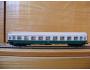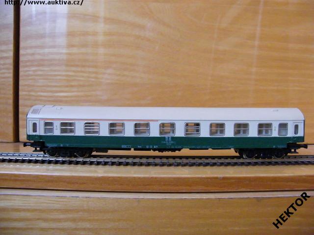 Sběratelský model 4osého rychlíkového vozu typu Y provedení ABme, DR, 1. a 2. třída, epocha IV, karosérie stříkaná v úrovni oken krémovou a pod okny tmavší zelenou i na rámu, čela stříkaná celá tmavší zelenou, logo DR tištěné bílou uprostřed pod okny na tmavším zeleném podkladu, číslo vozu a popisy tištěny bílou na tmavším zeleném podkladu i na rámu, nad 1. třídou je oranžový pruh, čísla třídy tištěna černou mezi okny na krémovém podkladu, bez směrové cedule, střecha stříkaná krémovou, v oknech propracovaný plastový výlisek a rámy obtažené stříbrnou, spodek vozu umělohmotný černý zaklapávací, 2osé podvozky umělohmotné černé, brzdová soustava součástí podvozku. Výrobcem BTTB koncem 80. letech, kat. č. 13616. Výměnná spřáhla typu BTTB černá a kovová dvojkolí pro odběr proudu pro osvětlení. Po zakoupení byl model odložen do vitríny a neježděn, je dlouho neježděn. Bez originální krabičky.