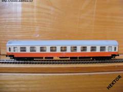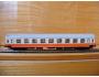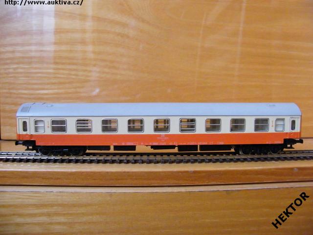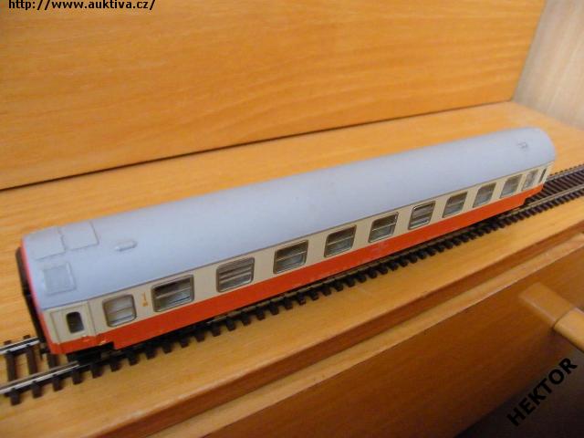 Sběratelský model 4osého rychlíkového vozu typu Y provedení Ame, DR, 1. třída, epocha IV, karosérie stříkaná v úrovni oken krémovou a pod okny tmavší oranžovou i na rámu, čela stříkaná celá tmavší oranžovou, logo DR tištěné bílou uprostřed pod okny na tmavším oranžovém podkladu, číslo vozu a popisy tištěny bílou na tmavším oranžovém podkladu i na rámu, nad 1. třídou NENÍ pruh, čísla třídy tištěna tmavší oranžovou mezi okny na krémovém podkladu, bez směrové cedule, střecha stříkaná světlou šedou, v oknech propracovaný plastový výlisek a rámy obtažené stříbrnou, spodek vozu umělohmotný černý zaklapávací, 2osé podvozky umělohmotné černé, brzdová soustava součástí podvozku. Výrobcem BTTB koncem 80. let, kat. č. 13615. Výměnná spřáhla typu BTTB černá a kovová dvojkolí pro odběr proudu pro osvětlení. Po zakoupení byl model odložen do vitríny a neježděn, je dlouho neježděn. Bez originální krabičky.