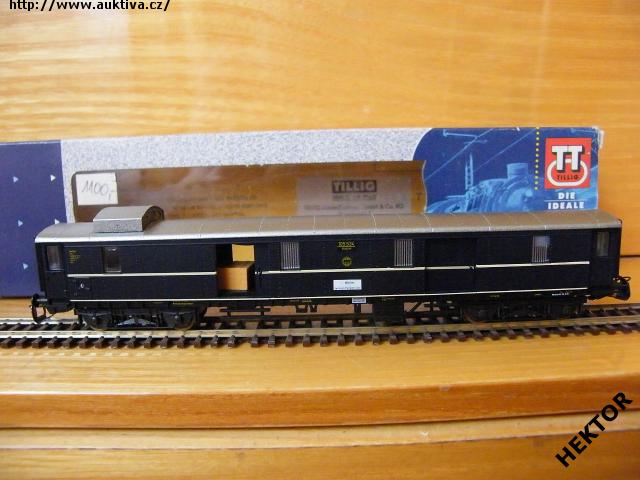 Sběratelský model 4osého starého rychlíkového služebního vozu se 4 vstupními dveřmi a 4 velkými posuvnými dveřmi typu Eilzugwagen provedení Pw 4i - 32, DRG, epocha II, karosérie stříkaná tmavou modrou a na rámu černou, pod okny jeden bílý pruh mezi dveřmi a dole druhý bílý pruh oddělující karosérii od rámu, logo DRG tištěné černou na žlutém kroužku mezi okny na tmavém modrém podkladu, číslo vozu tištěno žlutou na černém obdélníčku nahoře mezi okny, popisy tištěny žlutou vlevo u dveří na tmavém modrém podkladu a bílou a žlutou na rámu na černém podkladu, na boku oprostřed pod okny bílý obdélníček s černými nápisy jako směrová cedule, střecha s nástavbou stříkaná stříbrnou, rámy oken v rozích hranaté, v oknech umělohmotný propracovaný výlisek s naznačenými mřížemi, spodek vozu umělohmotný černý, 2osé podvozky umělohmotné černé, brzdová soustava součástí podvozku. Výrobcem Zeuke TT Bahn nebo Tillig v 90. letech, kat. č. 13829. Kinematika, šachta pro krátké spřáhlo a kovová dvojkolí černěná pro odběr proudu pro osvětlení vozu. Po zakoupení byl model odložen do vitríny a neježděn, je dlouho neježděn. V originální krabičce.