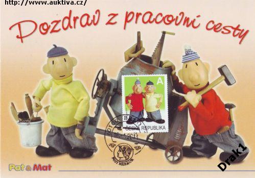 Analogická pohlednice Pat a Mat Pozdrav z pracovní cesty, známka č. 701 Cartes maximum