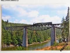 Barevná fotografie - velikosti 150 x 102 mm - s Českou parní lokomotivou 310.0 ČSD jede s osobním vlakem po Pňovanském mostě přes Hracholuskou přehradu do Bezdružic. Nová nepoužitá. Cena je za 1 kus.