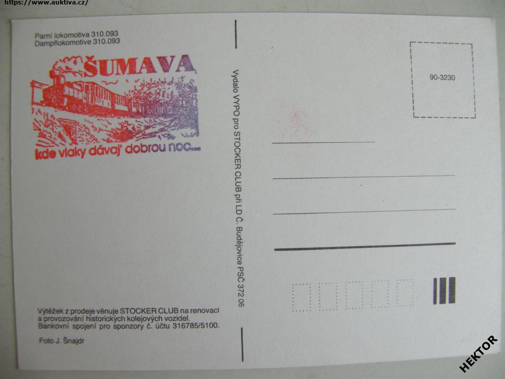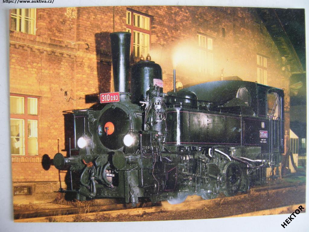 Barevná pohlednice parní lokomotivy 310.093 a razítko. Nová nepoužitá. Cena je za 1 kus.