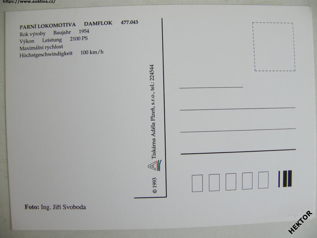 Barevná pohlednice parní lokomotivy 477.043. Nová nepoužitá. Cena je za 1 kus.