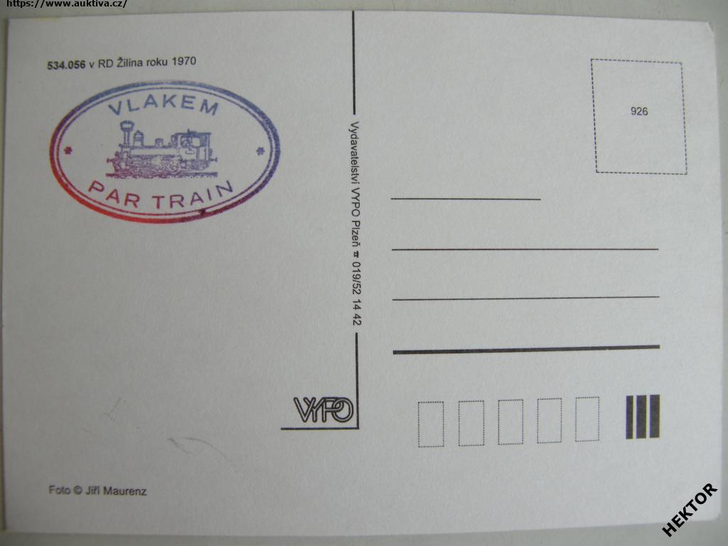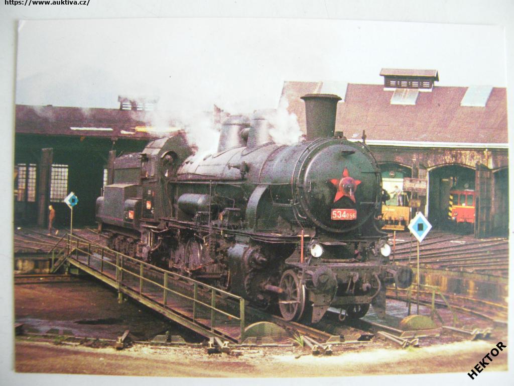 Barevná pohlednice parní lokomotivy 534.056 ČSD v RD Žilina, rok 1970 a razítko. Nová nepoužitá. Cena je za 1 kus.