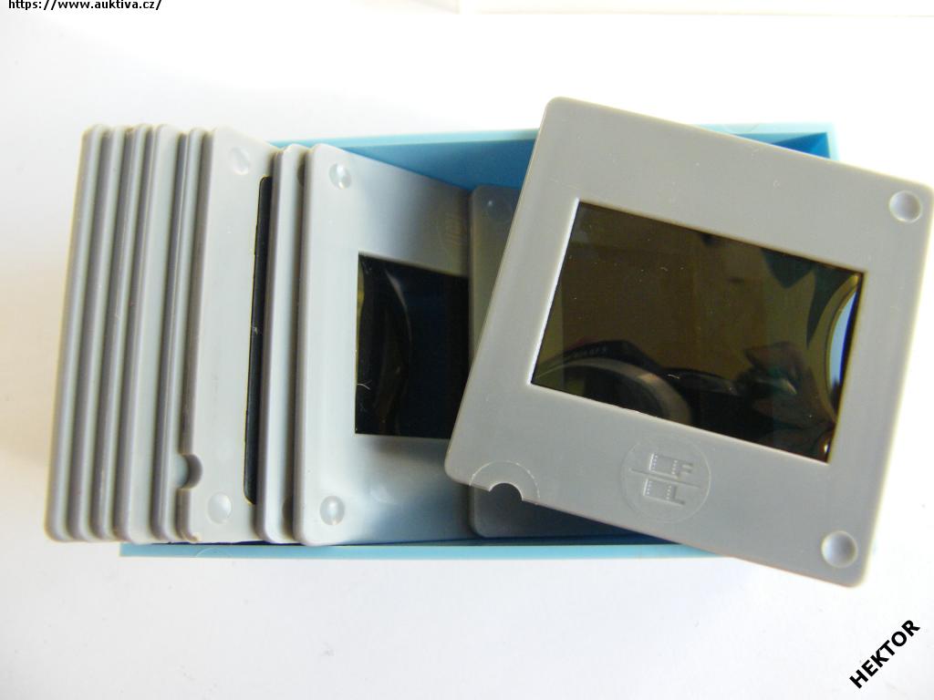Barevné diapozitivy - neznámé - 10 rámečků vč. malé krabičky. Málo používané. Cena je za celou krabičku.