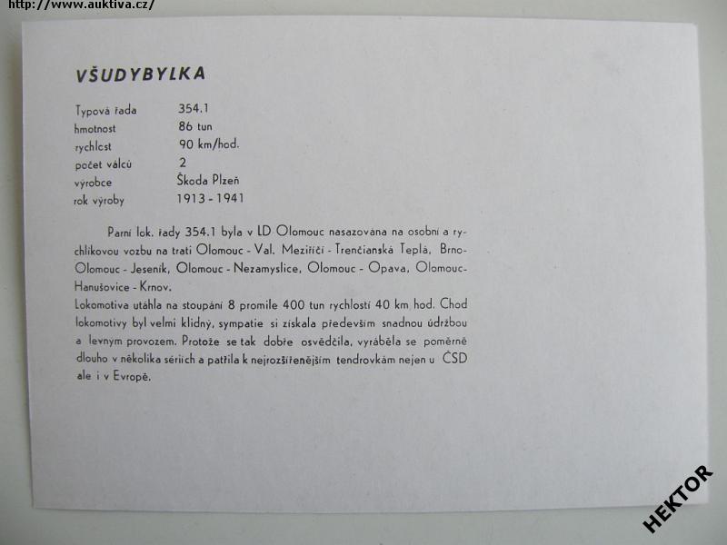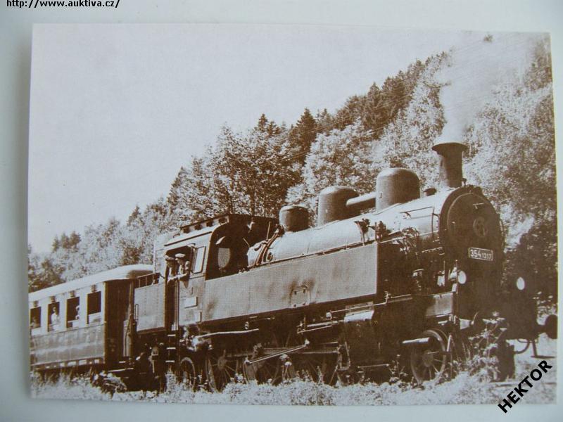 Černobílý obrázek parní lokomotivy řady 354.1 ČSD - zvaná VŠUDYBYLKA, velikosti 175 x 125 mm. Nový nepoužívaný, vydalo ČSD ředitelství Olomouc, nákladem 5000 výtisků pro vnitřní potřebu v roce 1989. Cena je za 1 kus.