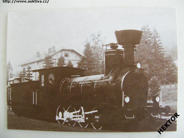 Černobílý obrázek parní lokomotivy řady 411.0 ČSD - zvaná ČTYŘISTAJEDENÁCT, velikosti 175 x 125 mm. Nový nepoužívaný, vydalo ČSD ředitelství Olomouc, nákladem 5000 výtisků pro vnitřní potřebu v roce 1989. Cena je za 1 kus.