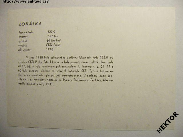 Černobílý obrázek parní lokomotivy řady 433.0 ČSD - zvaná LOKÁLKA, velikosti 175 x 125 mm. Nový nepoužívaný, vydalo ČSD ředitelství Olomouc, nákladem 5000 výtisků pro vnitřní potřebu v roce 1989. Cena je za 1 kus.