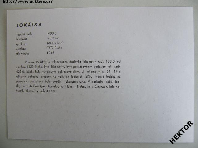 Černobílý obrázek parní lokomotivy řady 433.0 ČSD - zvaná LOKÁLKA, velikosti 175 x 125 mm. Nový nepoužívaný, vydalo ČSD ředitelství Olomouc, nákladem 5000 výtisků pro vnitřní potřebu v roce 1989. Cena je za 1 kus.