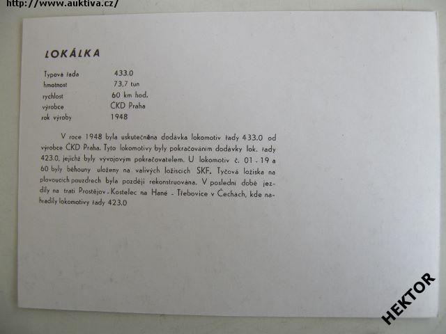 Černobílý obrázek parní lokomotivy řady 433.0 ČSD - zvaná LOKÁLKA, velikosti 175 x 125 mm. Nový nepoužívaný, vydalo ČSD ředitelství Olomouc, nákladem 5000 výtisků pro vnitřní potřebu v roce 1989. Cena je za 1 kus.