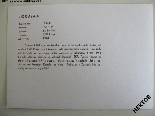 Černobílý obrázek parní lokomotivy řady 433.0 ČSD - zvaná LOKÁLKA, velikosti 175 x 125 mm. Nový nepoužívaný, vydalo ČSD ředitelství Olomouc, nákladem 5000 výtisků pro vnitřní potřebu v roce 1989. Cena je za 1 kus.