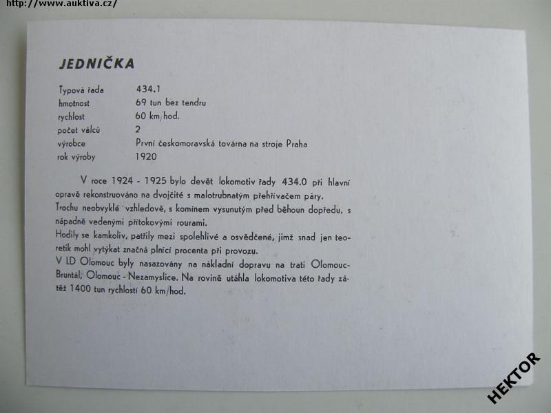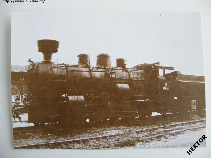 Černobílý obrázek parní lokomotivy řady 434.1 ČSD - zvaná JEDNIČKA, velikosti 175 x 125 mm. Nový nepoužívaný, vydalo ČSD ředitelství Olomouc, nákladem 5000 výtisků pro vnitřní potřebu v roce 1989. Cena je za 1 kus.