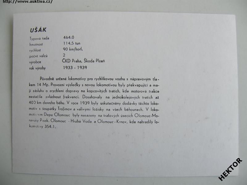 Černobílý obrázek parní lokomotivy řady 464.0 ČSD - zvaná UŠÁK, velikosti 175 x 125 mm. Nový nepoužívaný, vydalo ČSD ředitelství Olomouc, nákladem 5000 výtisků pro vnitřní potřebu v roce 1989. Cena je za 1 kus.