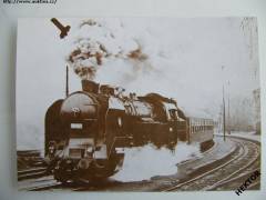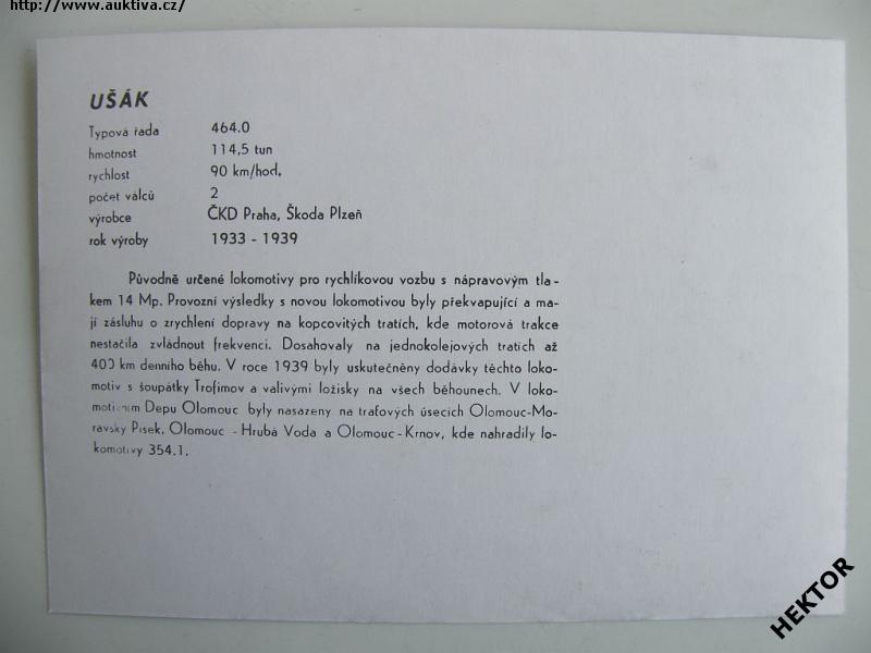 Černobílý obrázek parní lokomotivy řady 464.0 ČSD - zvaná UŠÁK, velikosti 175 x 125 mm. Nový nepoužívaný, vydalo ČSD ředitelství Olomouc, nákladem 5000 výtisků pro vnitřní potřebu v roce 1989. Cena je za 1 kus.