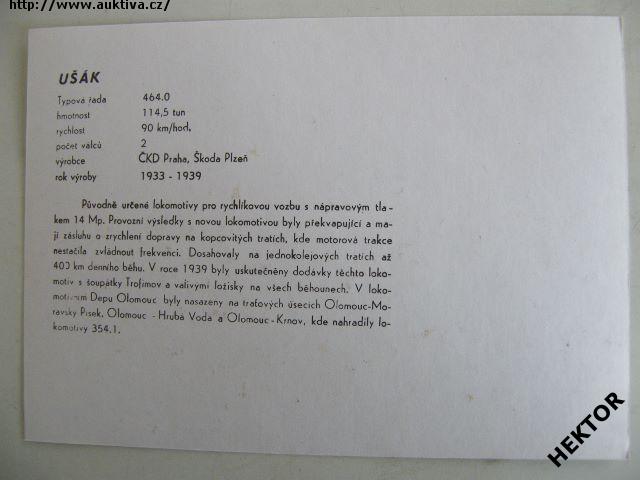 Černobílý obrázek parní lokomotivy řady 464.0 ČSD - zvaná UŠÁK, velikosti 175 x 125 mm. Nový nepoužívaný, vydalo ČSD ředitelství Olomouc, nákladem 5000 výtisků pro vnitřní potřebu v roce 1989. Cena je za 1 kus.