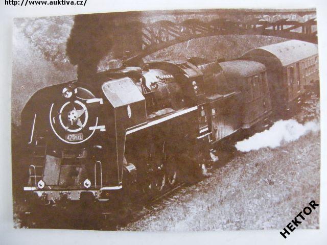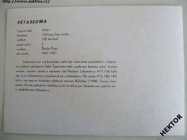 Černobílý obrázek parní lokomotivy řady 475.1 ČSD - zvaná PĚTASEDMA, velikosti 175 x 125 mm. Nový nepoužívaný, vydalo ČSD ředitelství Olomouc, nákladem 5000 výtisků pro vnitřní potřebu v roce 1989. Cena je za 1 kus.