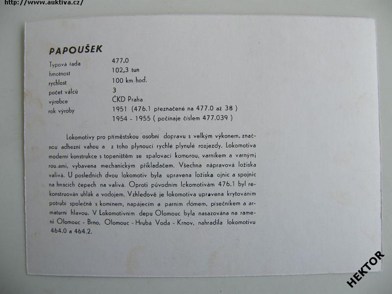 Černobílý obrázek parní lokomotivy řady 477.0 ČSD - zvaná PAPOUŠEK, velikosti 175 x 125 mm. Nový nepoužívaný, vydalo ČSD ředitelství Olomouc, nákladem 5000 výtisků pro vnitřní potřebu v roce 1989. Cena je za 1 kus.
