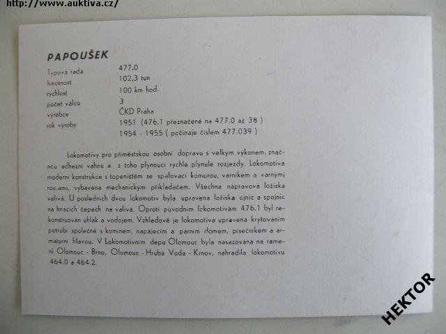 Černobílý obrázek parního válce parní lokomotivy řady 477.0 ČSD - zvaná PAPOUŠEK, velikosti 175 x 125 mm. Nový nepoužívaný, vydalo ČSD ředitelství Olomouc, nákladem 5000 výtisků pro vnitřní potřebu v roce 1989. Cena je za 1 kus.