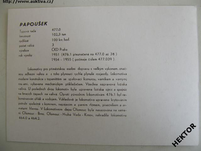 Černobílý obrázek parní lokomotivy řady 477.0 ČSD - zvaná PAPOUŠEK, velikosti 175 x 125 mm. Nový nepoužívaný, vydalo ČSD ředitelství Olomouc, nákladem 5000 výtisků pro vnitřní potřebu v roce 1989. Cena je za 1 kus.